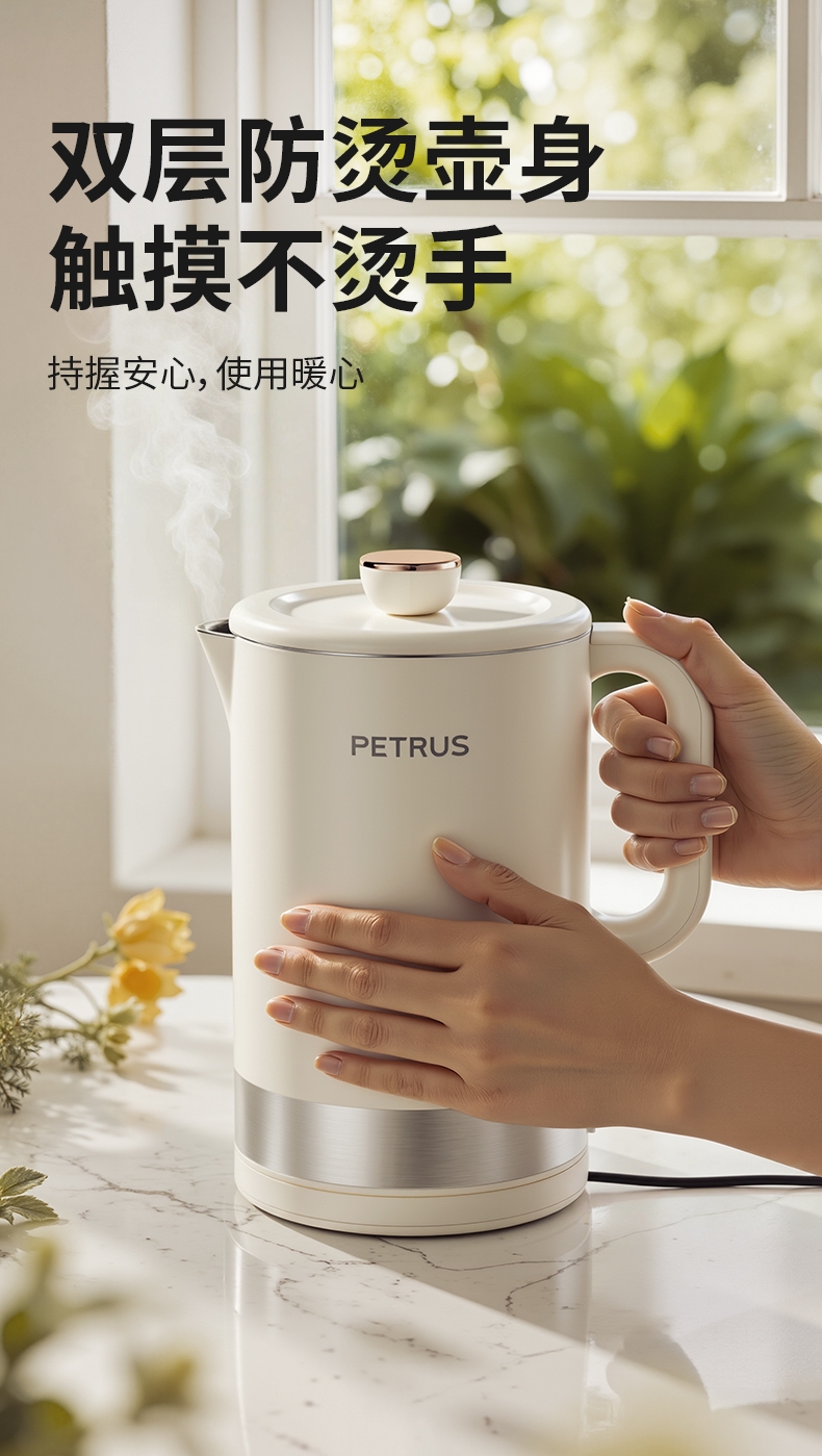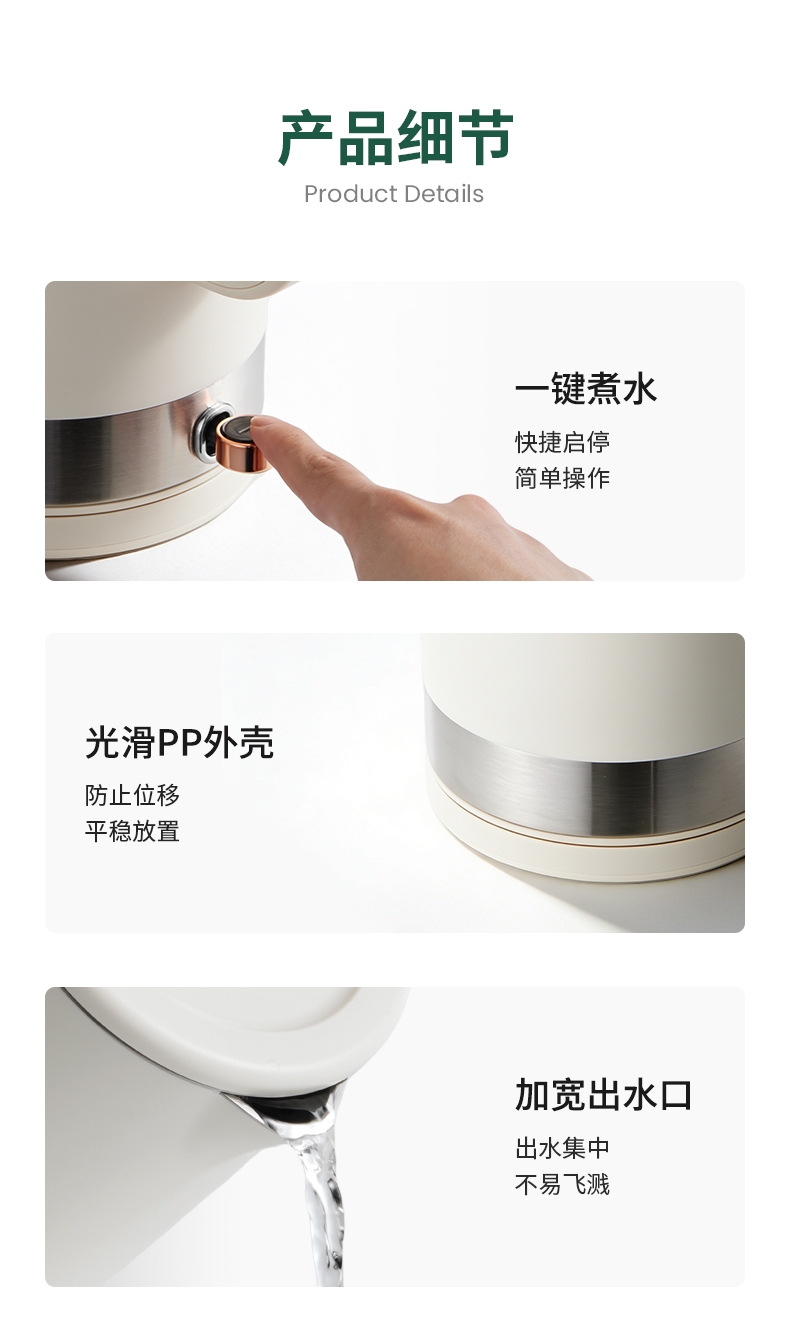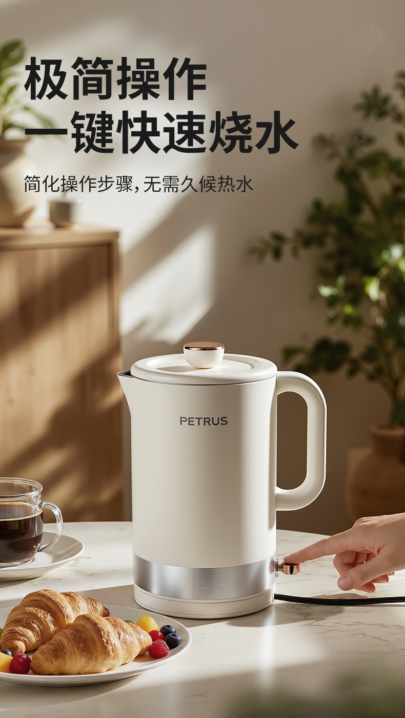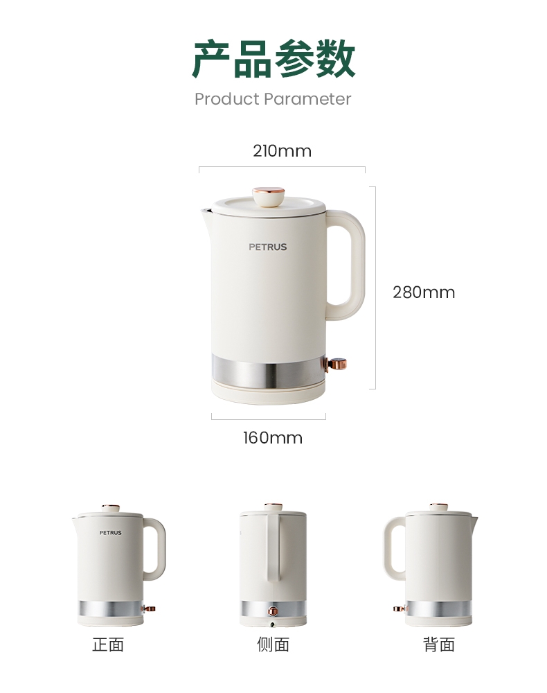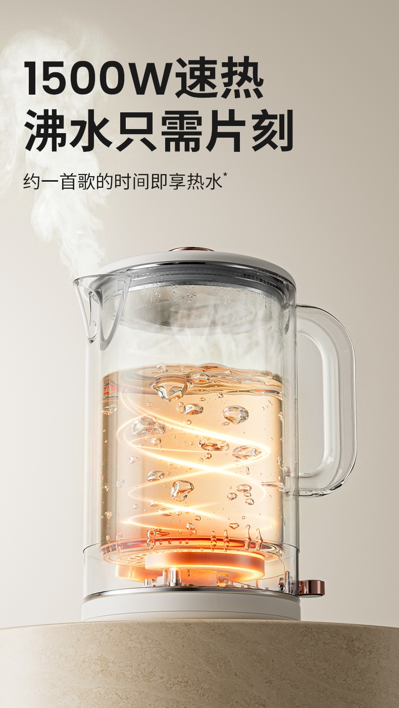 1500W 快速沸腾,煮水不用久等;一体不锈钢无缝焊接内胆,不藏污无异味;双层中空结构,内高温煮水,机身不烫