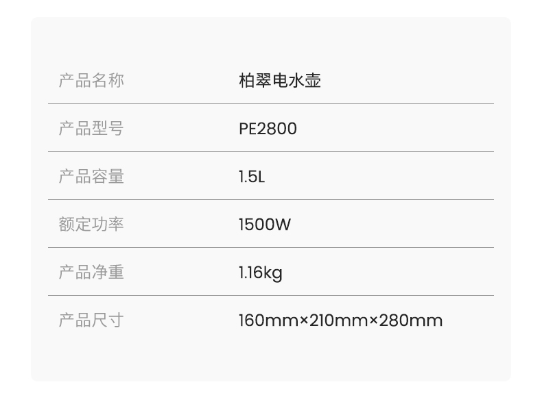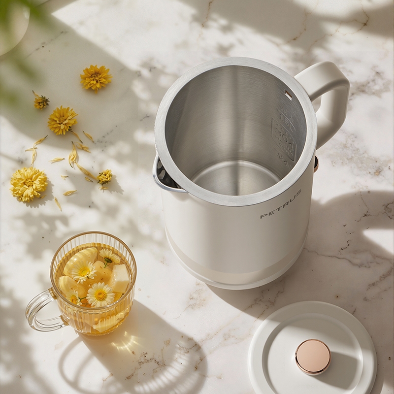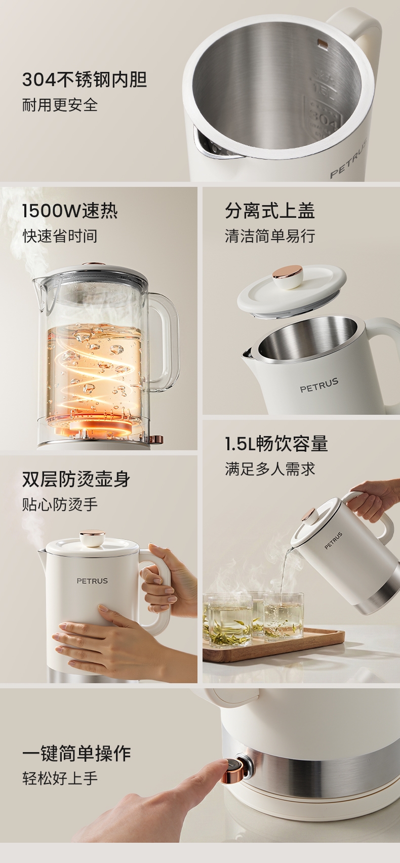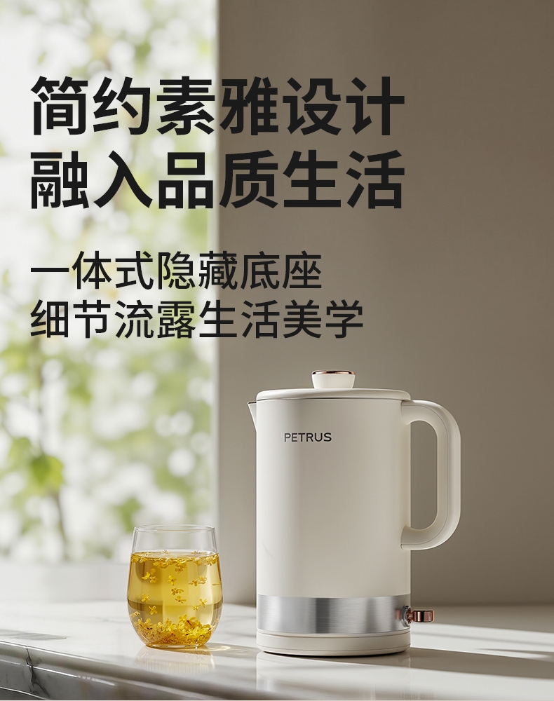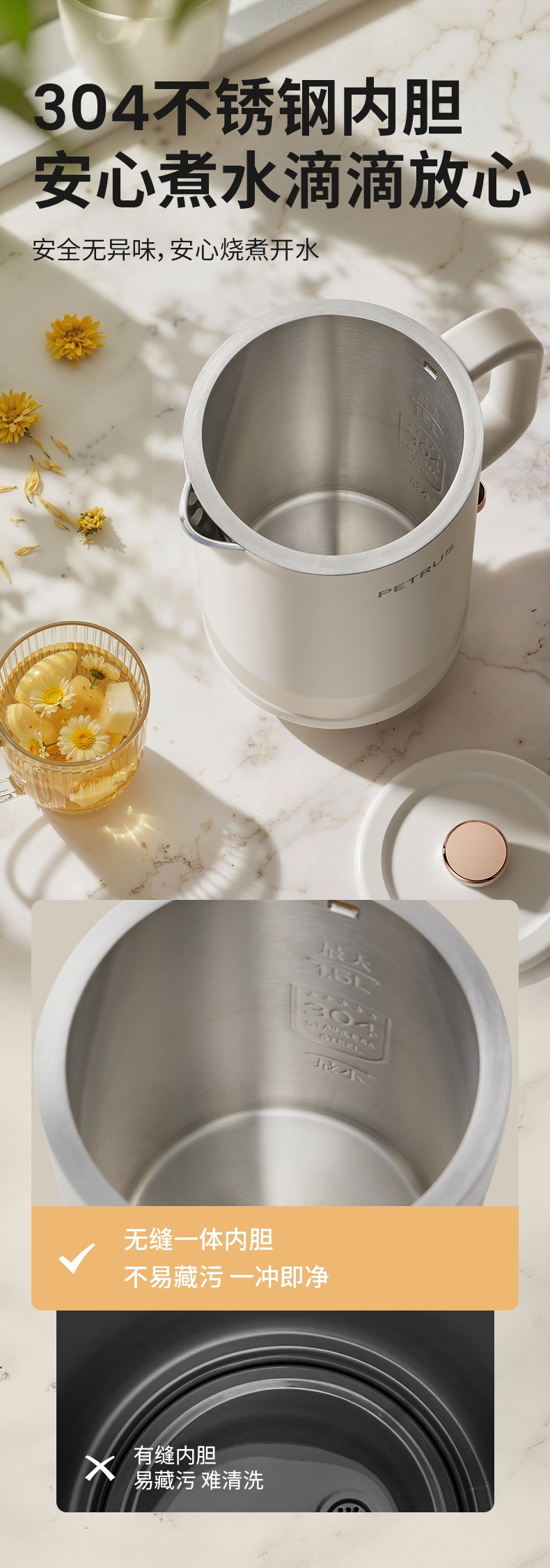 1500W 快速沸腾,煮水不用久等;一体不锈钢无缝焊接内胆,不藏污无异味;双层中空结构,内高温煮水,机身不烫