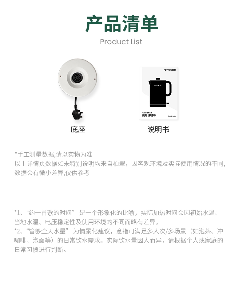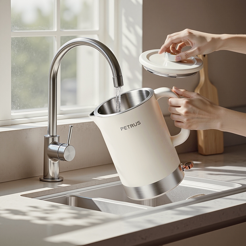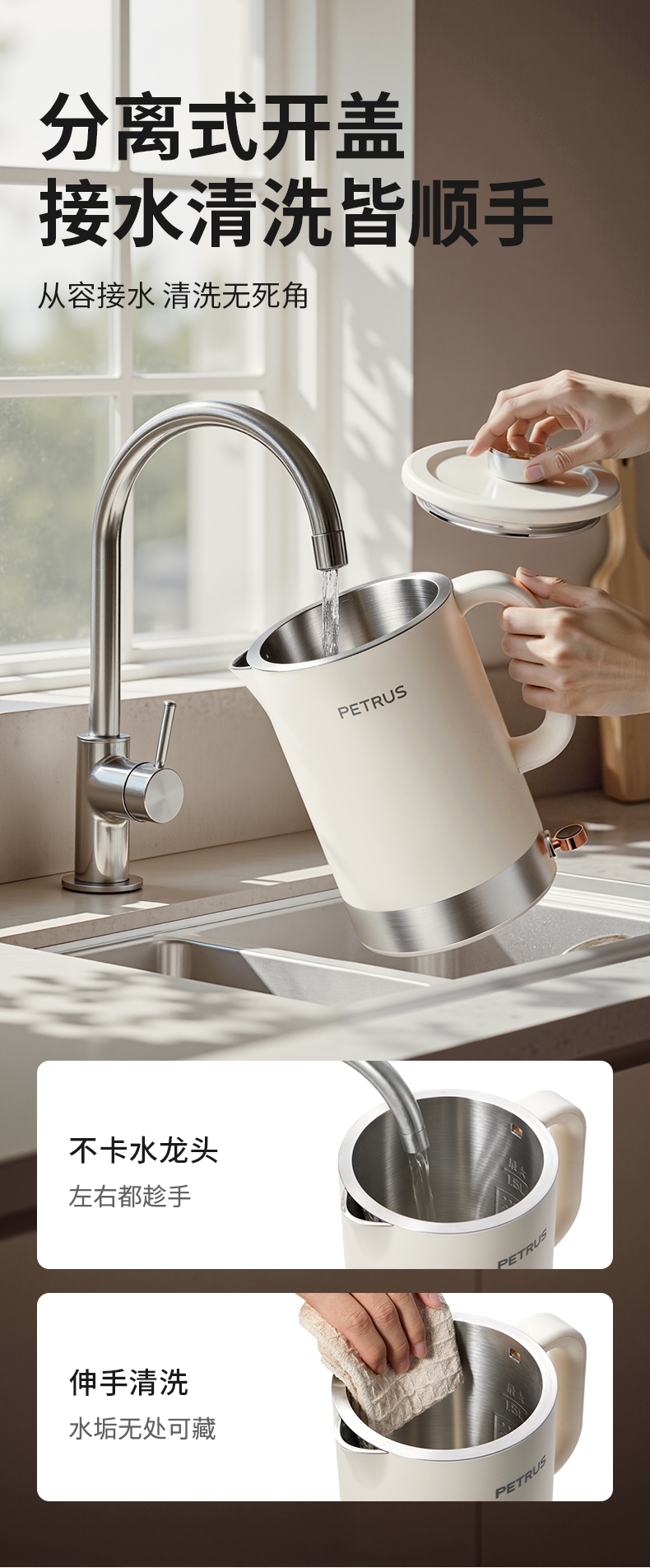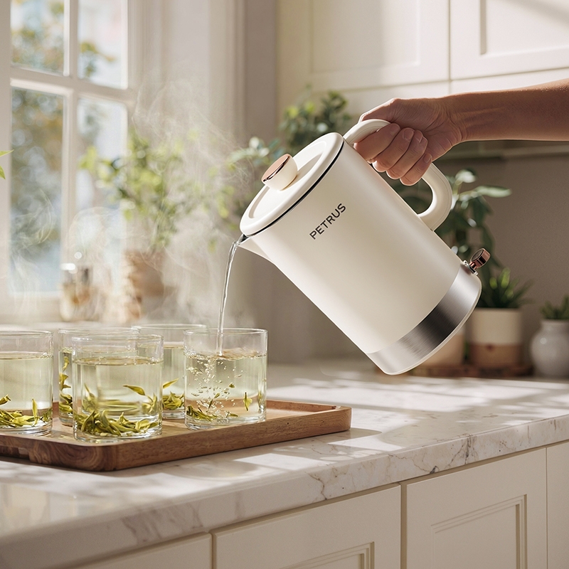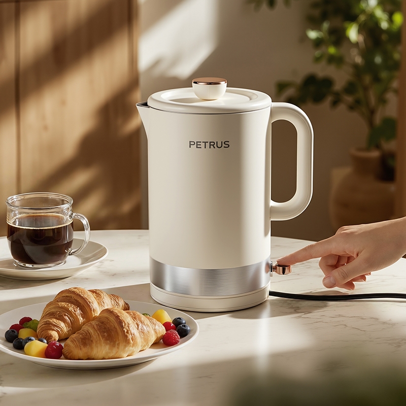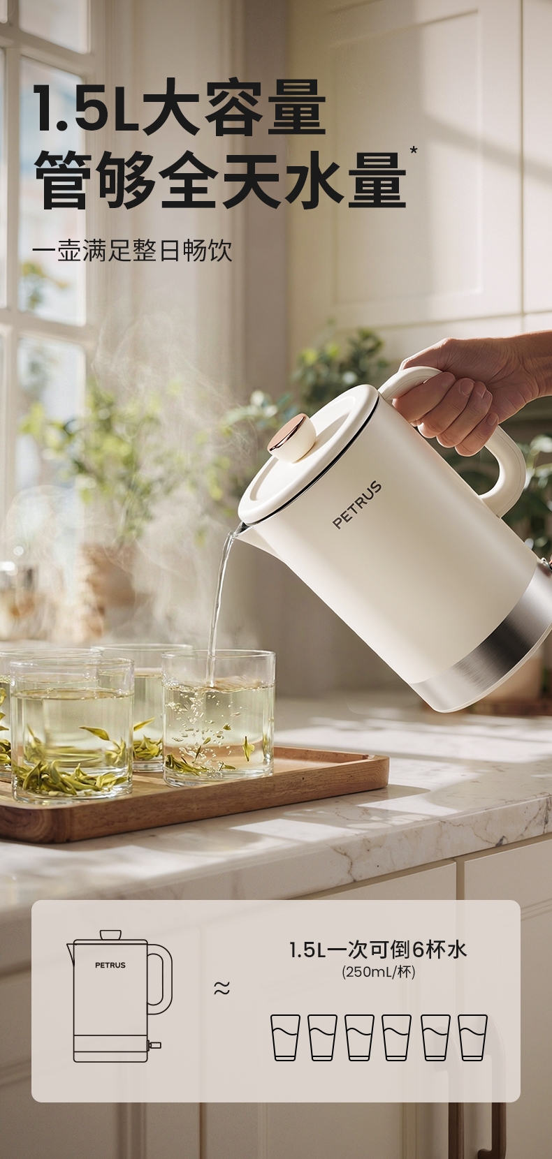 1500W 快速沸腾,煮水不用久等;一体不锈钢无缝焊接内胆,不藏污无异味;双层中空结构,内高温煮水,机身不烫